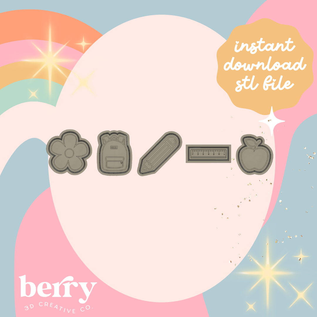 Pack of 5 Teacher stamps, backpack, flower, ruler, apple, pencil Stamp and cutter STL file
